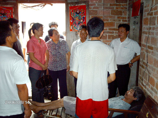2006年8月14日上午,团市委陈颖副书记、新奥燃气公司胡克武总经理与麻章区团委书记、妇联主席等到麻章区湖光镇东岭村慰问特困低保户林明建同学。