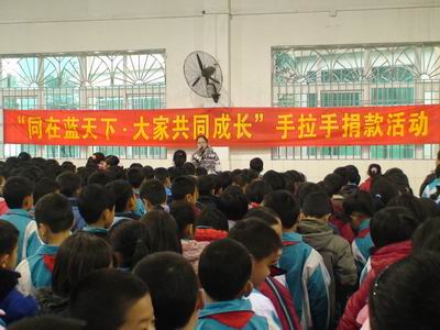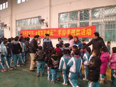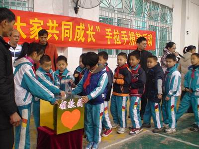 新春伊始,深湾小学的“千校扶千校”活动又谱出了新的内容。2月15日上午,深湾小学的全校师生集合在学校的体育馆,举行“同在蓝天下,大家共成长”为信宜市怀乡镇第一中心小学献爱心的扶贫捐款活动。“爱是人类最美丽的语言,爱是正大无私的奉献……”一首《爱的奉献》在深湾小学的校园里回荡久久。 虽然天气寒冷,但是体育 馆里却回荡着一股股暖流,深湾小学全体师生正在进行扶贫捐款活动。捐款活动在深湾小学李杰华校长带领下正式开始。只见全校六十多位老师排着长长的队伍,在李校长的带领下,欢快地走向捐款箱,郑重地把带着自己爱心的善款投入捐款箱。接着,由各班学生进行捐款。各班的孩子们排着队伍,在“爱的奉献”的歌声伴随下,一个个走到捐款箱前,把一份份爱心献给信宜市怀乡镇第一中心小学的孩子们。 相信:爱是我们共同的语言。如果人人都献出自己的一点爱心,等到汇聚起来时,它将是支援信宜市怀乡镇第一中心小学的一笔巨大财富。