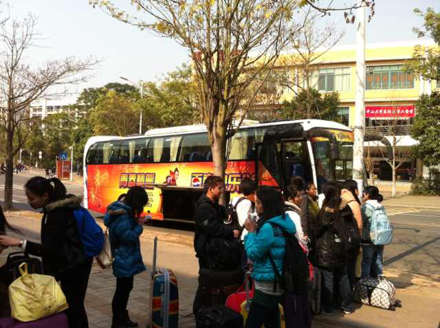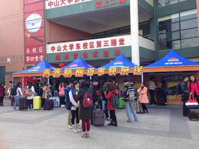 小伙伴,回家啦!开学之初,恍在昨日;回家之时,终在今朝。一路平安,一车幸福,百事可乐,伴你回家!为服务寒假春节期间大学生返乡出行,团省委、省学联联合百事可乐有限公司,开展“青春情暖·把乐带回家”送站服务活动。本活动自12日开始接受学生自主报名预约,17-19日的3天时间内,安排多辆大巴进驻高校定点接送回家心切的同学,分别在广州大学城和五山高校圈共6个接送点,每天6点至21点分设5班车,共计免费接送逾6000名学生到广州火车站、广州南站和白云国际机场。回家的大巴向着春天进发,贴心服务永远伴随你身边!