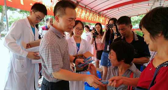 在五邑中医院恩平分院义诊现场,梁均达副书记亲切慰问志愿者,叮嘱他们天气炎热要注意防暑防晒,并向志愿者赠予慰问品。同时,梁书记还向现场群众赠送广东省中医院特色制剂及生活用药品。