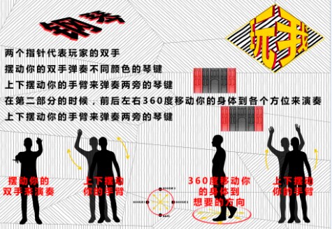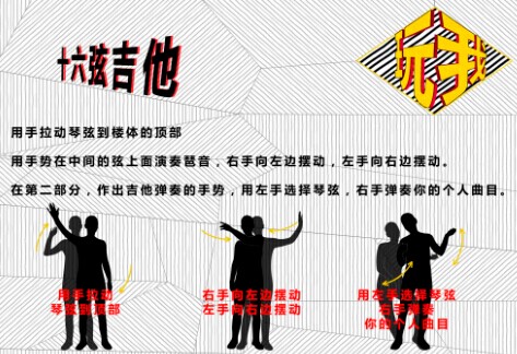 巴黎浪漫创意团队Danny Rose,合六人之力,历时大半年制作的的3d立体互动投影小游戏。Danny Rose把里面的一组六个的小游戏的形容为建筑墙体上的“音乐雕塑”,分别是《出格钢琴》《黄铜机器》《跳舞手风琴》《16里弦》《巴西打击节奏》和《字谜声音》。通过3d实时动作捕捉系统(3D real time motion capture system),观众被邀请到玩家平台上。这套系统上有多个感应器,玩家在平台上的动作会透过感应器实时触发楼体投影上相对的视觉变化。