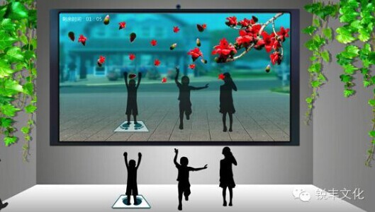 游戏二:游戏说明体验者进入体验区时,AR系统启动,屏幕中呈现现实场景并出现游戏规则。游戏倒计时结束后,大屏出现木棉树,同时从屏幕上方落下卡通木棉花宝宝,象征一个个小生命降临到广州这片乐土。体验者挥手触碰到花宝宝后,花宝宝便自动飞向枝头并逐渐绽放开花,象征儿童是广州的未来,美好而热烈,充满朝气和活力。