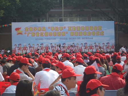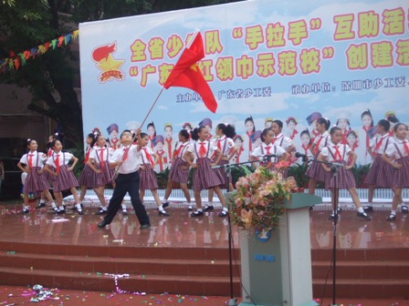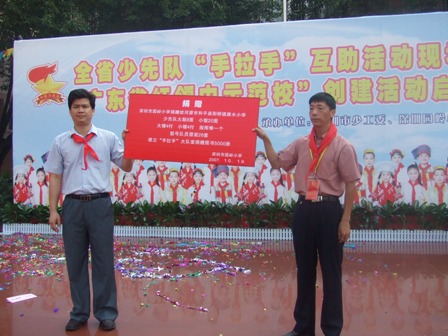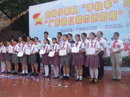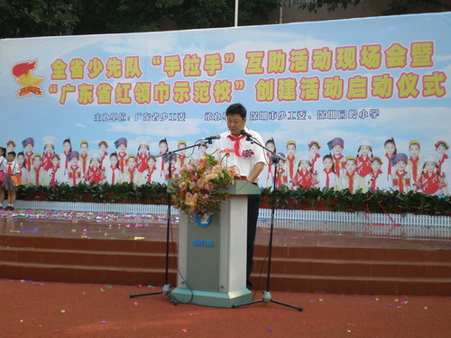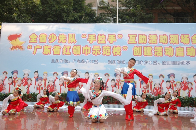 在举国上下庆祝党的十七大隆重召开之际,广东省少工委在深圳市园岭小学隆重举行全省少先队“手拉手”互助活动现场会暨“广东省红领巾示范校”创建活动启动仪式。在现场会上,表彰总结一批在服务和谐社会建设中的表现突出的“手拉手”互助活动先进集体和“手拉手好队员”,共庆少先队建队58周年。现场举行了“手拉手”互助活动签约仪式,来自贵州以及广东河源、梅州等地的山区学校代表和深圳地区十所优秀学校结成手拉手学校。深圳园岭小学与结队已两年多的和平县明阳镇雅水小学举行了赠送仪式。园岭小学赠送了一大批队鼓支持雅水小学队部室建设。仪式结束后,园岭小学的少先队员还表演了他们创作的歌曲:园岭小学喜事多及以手拉手为主题的舞蹈雪山的希望等节目。