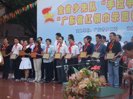 本次表彰大会是我省首次对“手拉手”活动进行专题表彰,是对我省开展“手拉手”活动的一次阶段性总结表彰。获得表彰的40个先进集体和90名好队员,都是经过层层严格考核评选,在“手拉手”活动中表现突出,得到社会的广泛好评。如阳江市的雏鹰学校,长期开展“手拉手”活动,先后与阳东县大八镇罗田小学、阳西县溪头镇宫花小学和阳西县长歧小学结队。每年“六一”都邀请结队学校的小伙到其学校共同欢度节日,同时开展各种活动支持结队学校。几年来,共为其结队的三所小学捐款、捐物折合人民币八万多元,有力的支持了三所小学的读书室、教学设备等的建设