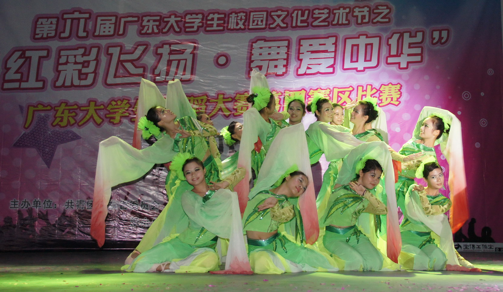 第六届广东大学生校园文化艺术节之“红彩飞扬 舞爱中华”大学生舞蹈大赛由共青团广东省委员会、省教育厅、省文化厅及省学生联合会联合主办,韩山师范学院团委会承办第四赛区比赛。广东省舞蹈家协会会员、潮州市舞蹈家协会名誉主席石应瑞,潮州市群众文化艺术馆音乐舞蹈部主任邱雪茹,潮州市老干部学校舞蹈教师、潮州市舞协念力艺苑艺术总监刘少淮,汕头市歌舞团编导、汕头大学舞蹈教师窦博,韩山师范学院音乐系专职舞蹈教师缪佳骏应邀担任大赛评委。韩山师范学院团委书记郑文锋、音乐系主任刘元平,汕尾职业技术学院学生处处长谢创雄、团委书记林祖参、艺体系副主任李莉出席比赛现场。